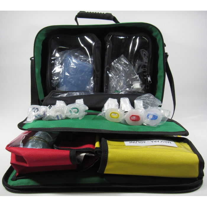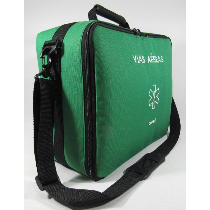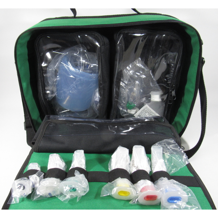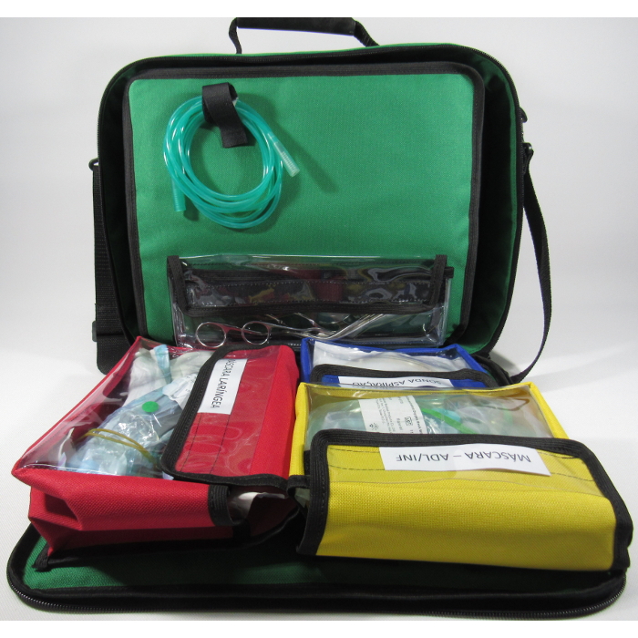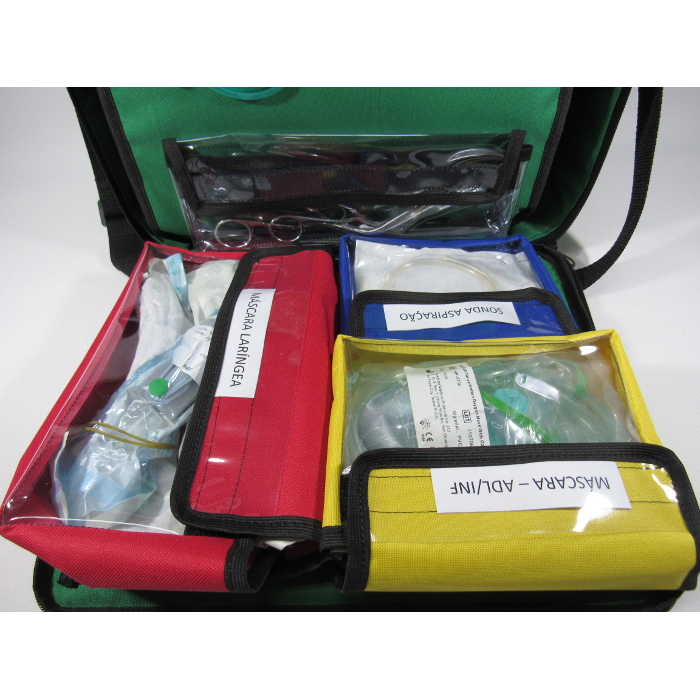 O interior da maleta possui uma divisória e há estojos para acondicionar itens com reanimador manual adulto, infantil e neo, pinças, sondas e máscaras. Possui elástico para fixação de cânulas de Guedel.